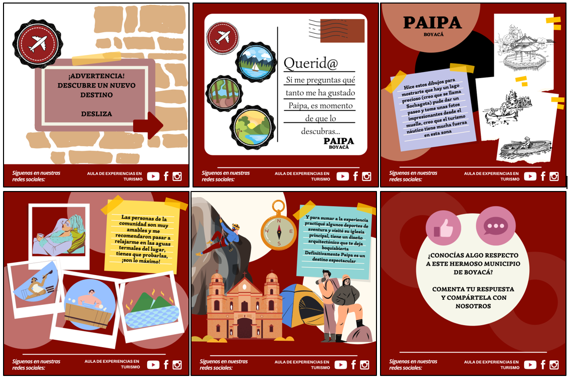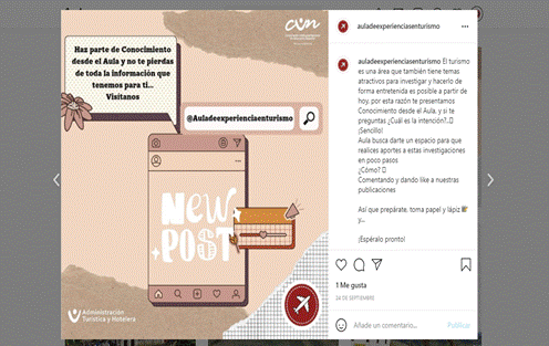 Por esta razón, espacios como Aula de Experiencias en Turismo, generada a partir de la virtualidad, proponen esta misma dinámica para darle visualización a contenidos investigativos con poca cabida en estos medios a través uso de redes sociales.(3) Esta parte de la premisa de la divulgación del conocimiento generado a lo largo de diferentes procesos de análisis de datos con la intención de enriquecer el conocimiento y presentarlo de manera más dinámica para facilitar la apropiación de dicha información; por tanto, una de sus apuestas obedece a la de las redes con menos visibilidad en elementos investigativos como el Instagram, que abre un gran escenario de participación ante esta propuesta de contenido.(4)