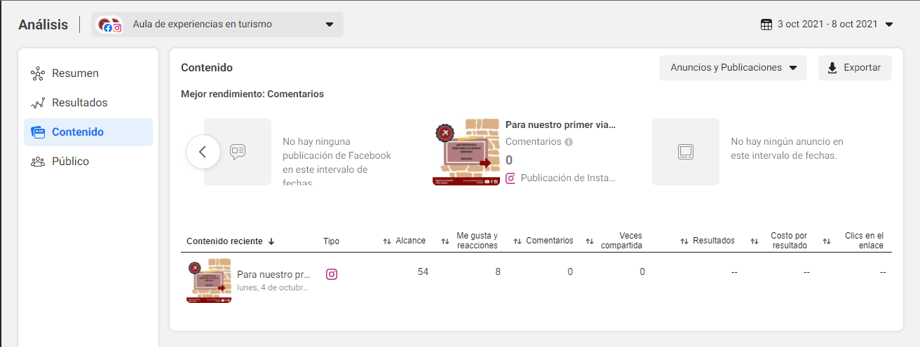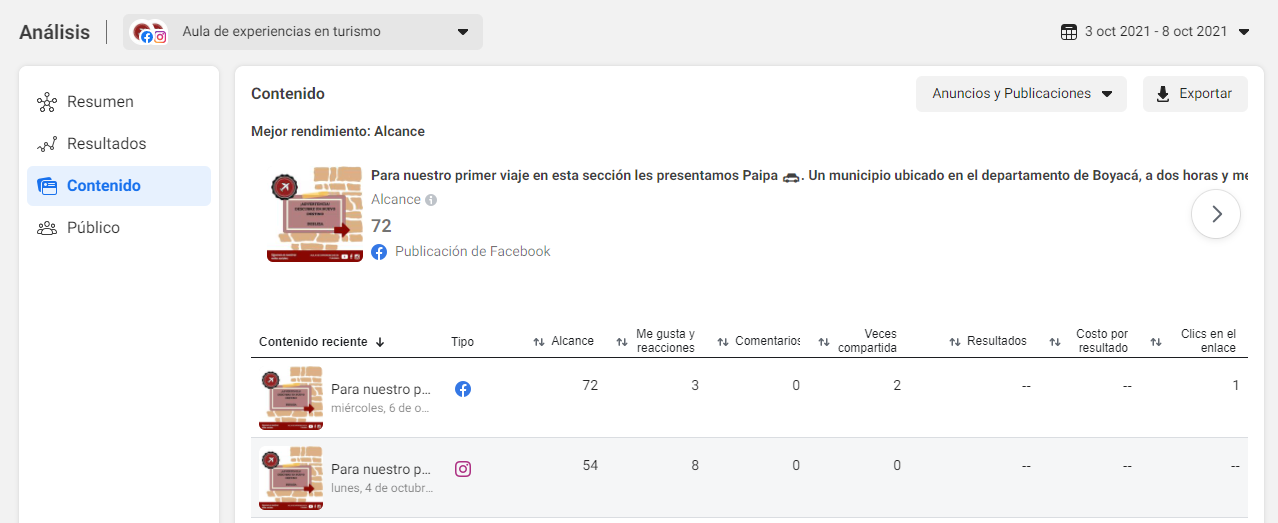 Esta información es indispensable en el proceso de retroalimentación y de la elaboración de contenido, puesto que señala la afinidad que los usuarios tienen con el contenido y permite la identificación de los elementos que generan atracción en los seguidores del espacio.(18,19) El análisis de métricas es una dinámica muy detallada que requiere de un estudio mucho más a fondo, que se lleva a cabo mediante el análisis, interpretación y funcionalidad de espacios como el Aula de experiencias de turismo y que permiten profundizar en los procesos de investigación.