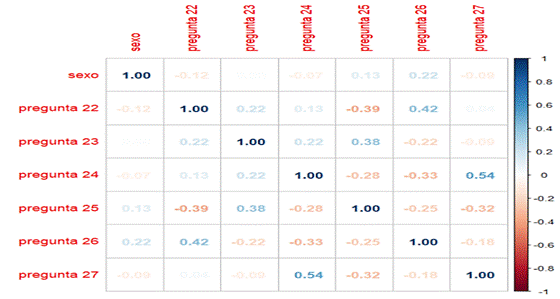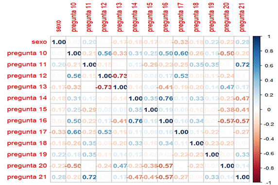 In the preceding figure, when analyzing the questions that make up this dimension, a significant association between questions 11 and 21 was observed (Rho=0,71 p=<0,01). Both questions might be measuring the same problem-solving capability. Nonetheless, questions 14 and 16 have a high relationship (Rho=0,75 p=<0,01).