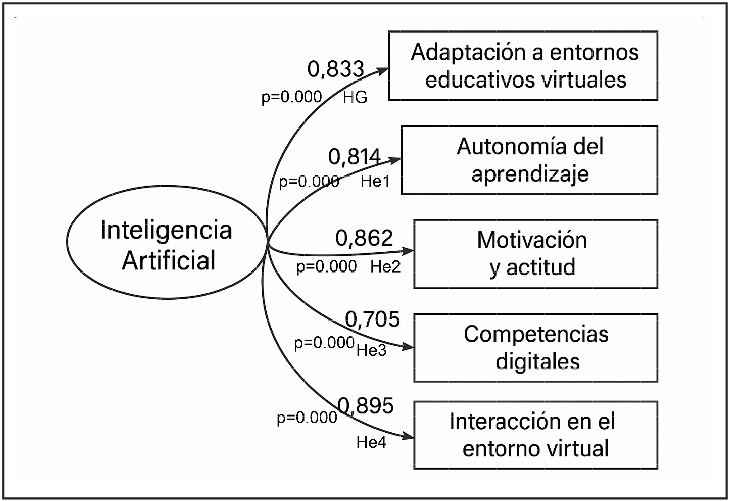 El modelo también revela que la IA tiene una relación fuerte con la autonomía del aprendizaje (0,814). Este hallazgo sugiere que la integración de la IA en los entornos educativos virtuales fomenta la autorregulación y la capacidad de los estudiantes para gestionar su propio aprendizaje, lo cual es fundamental en entornos donde la supervisión directa del docente es limitada.