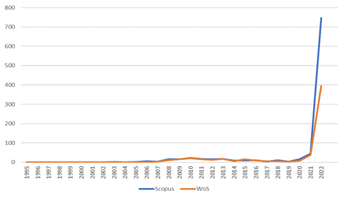 Figura 1. Distribución de los estudios sobre metaverso en Scopus y WoS de 1995 a 2022
