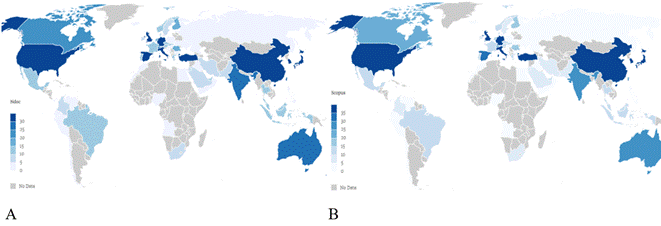 The analysis of the scientific output brought together according to countries showed China and the United States as maximum producers, where we found 17,82 % in Scopus and 19,69 % in WoS and 16,17 % in Scopus and 17,81 % in WoS respectively.