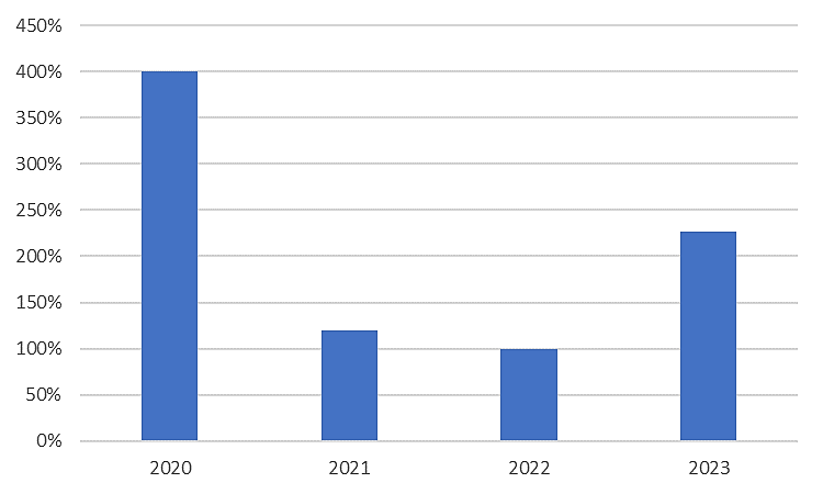 222 documents were identified, of which 69 were articles, 50 were conference papers, 36 were editorials, 29 were notes, 19 were letters, 14 were reviews, 3 were conference reviews, and 2 were short surveys. In terms of the number of documents per year, 2 were found in 2019, 10 in 2020, 22 in 2021, 44 in 2022, and 144 in 2023. The year-on-year growth rate was over 100 % in all years (figure 1).