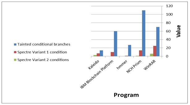 Also, in the figures 6 and 7 we notice a clear difference in the tainted conditional branches, Specter Variant 1 (V1) condition and Specter Variant 2 (V2), which were tested before and after the update. All three are clearly increased by increasing the security of the proposed architecture.
