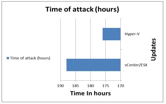 The first procedure, as soon as the vendor provides an update, install it on the hypervisor. Most hypervisors include capabilities that will automatically look for modifications and install them if any are detected. In addition to that sending an alternation for manager about the attacks. As shown in below table 4 and figure 9, that indicated to the attacks time after hypervisor updated.